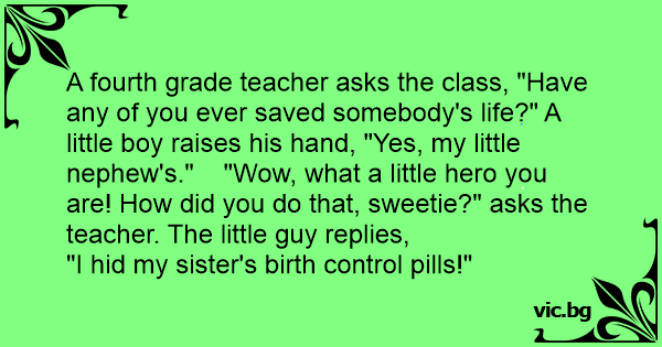 A fourth grade teacher asks the class, "Have any of you ever saved somebody's life?" A little boy raises his hand, "Yes, my little nephew's." "Wow, what a little hero you are! How did you do that, sweetie?" asks the teacher. The little guy replies,
