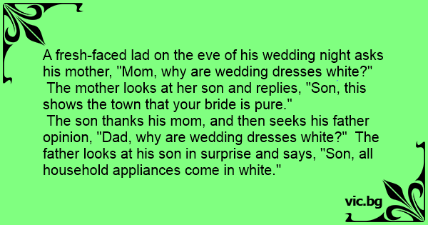 Синот ја прашува мајка си: - Мамо, зошто венчаниците се бели? Мајката одговора: - Венчаницата покажува на пријателите и Роднините дека невестата е чиста. Синот за секој случај го прашува истото...