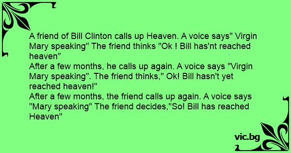 A friend of Bill Clinton calls up Heaven. A voice says" Virgin Mary speaking" The friend thinks "Ok ! Bill has'nt reached heaven"