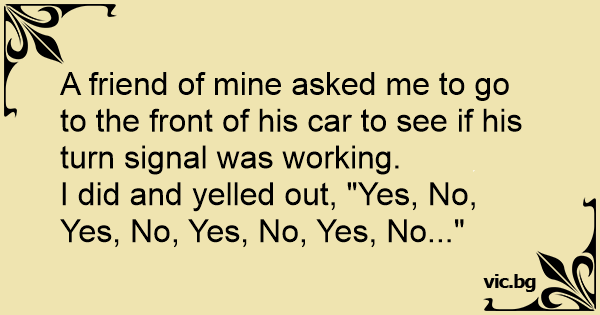 A friend of mine asked me to go to the front of his car to see if his turn signal was working.