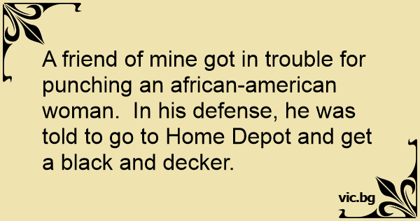 A friend of mine got in trouble for punching an african-american woman. In his defense, he was told to go to Home Depot and get a black and decker.