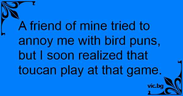 A friend of mine tried to annoy me with bird puns, but I soon realized that toucan play at that game.