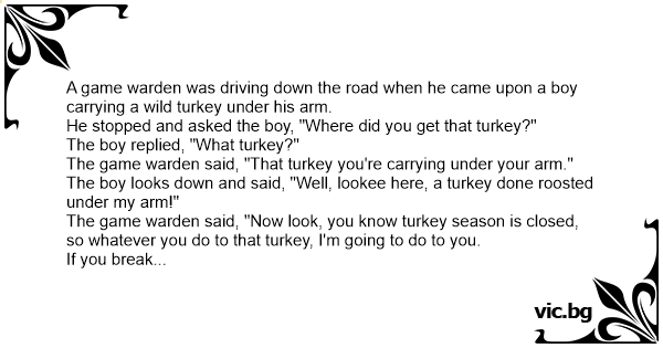 The game warden said, "Now look, you know turkey season is closed, so whatever you do to that turkey, I'm going to do to you.