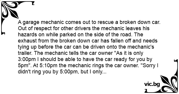 A garage mechanic comes out to rescue a broken down car. Out of respect for other drivers the mechanic leaves his hazards on while parked on the side of the road. The exhaust from the broken down car has fallen off and needs tying up before the car can be driven onto the mechanic's trailer. The mechanic tells the car owner "As it is only 3:00pm I should be able to have the car ready for you by 5pm". At 5:10pm the mechanic rings the car owner. "Sorry I didn't ring you by 5:00pm, but I only got back to the garage 5 minutes ago. "Why, what happened?" asked the car owner. "My vehicle battery went flat, and I had to ring the garage to ask for another mechanic to come out and rescue me," replied the mechanic.