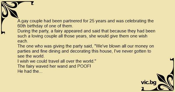 Una coppia sta festeggiando le nozze d’argento e contemporaneamente anche i 60 anni di vita. Durante la celebrazione appare una fata e dice alla coppia: “come premio per la vostra fedeltà di 25...
