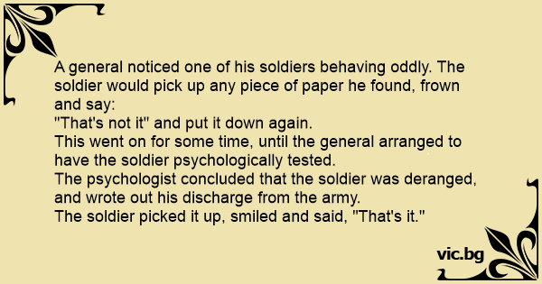 This went on for some time, until the general arranged to have the soldier psychologically tested.
