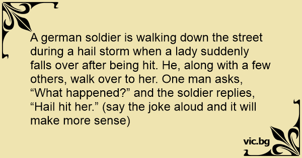 A german soldier is walking down the street during a hail storm when a lady suddenly falls over after being hit. He, along with a few others, walk over to her. One man asks, “What happened?” and the soldier replies, “Hail hit her.” (say the joke aloud and it will make more sense)