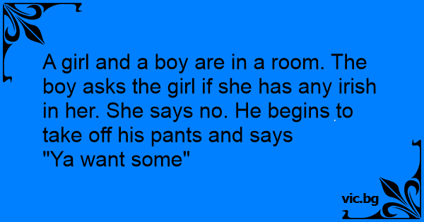 A girl and a boy are in a room. The boy asks the girl if she has any irish in her. She says no. He begins to take off his pants and says