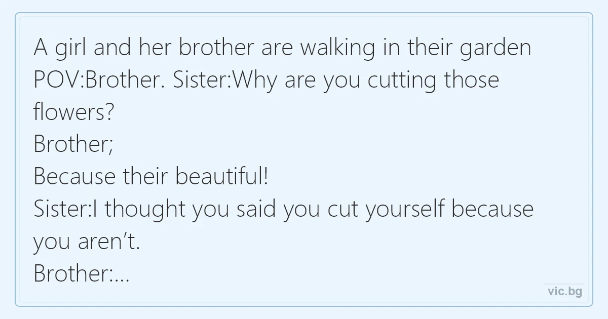 A girl and her brother are walking in their garden POV:Brother. Sister:Why are you cutting those flowers?<br />Brother;<br />Because their beautiful!<br />Sister:I thought you said you cut yourself because you aren’t.<br />Brother:…