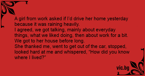 She thanked me, went to get out of the car, stopped, looked hard at me and whispered, “How did you know where I lived?”
