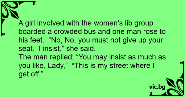 A girl involved with the women’s lib group boarded a crowded bus and one man rose to his feet. “No, No, you must not give up your seat. I insist,” she said.