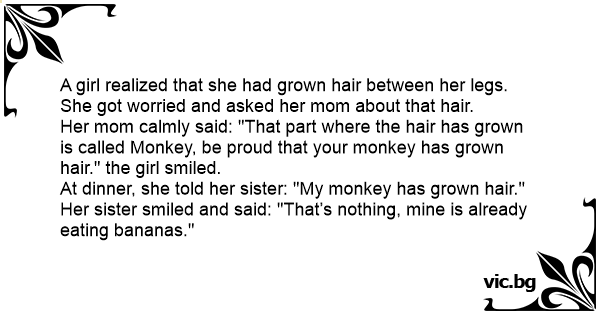 En jente var bekymret for at hun hadde fått hår mellom bena. Hun spurte moren om håret hennes. Moren hennes sa rolig: "Den delen hvor håret har vokst heter Monkey, vær stolt over at apen din har...