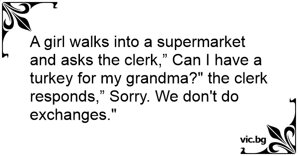 A girl walks into a supermarket and asks the clerk,” Can I have a turkey for my grandma?" the clerk responds,” Sorry. We don't do exchanges."