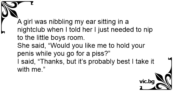 A girl was nibbling my ear sitting in a nightclub when I told her I just needed to nip to the little boys room.