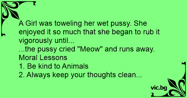 Едно момиче подсушавало с хавлията своето мокро коте. На нея и харесвало много, затова започнало да търка по енергично, докато ... котето измяучило и избягало. Изводи: 1. Бъдете нежни с животните. 2, Бъдете с чисто съзнание