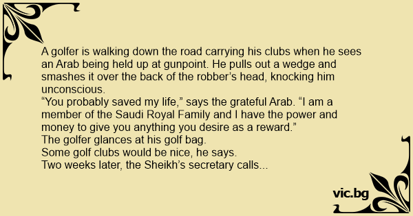 A golfer is walking down the road carrying his clubs when he sees an Arab being held up at gunpoint. He pulls out a wedge and smashes it over the back of the robber’s head, knocking him unconscious.