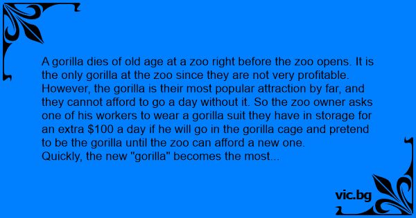 However, the gorilla is their most popular attraction by far, and they cannot afford to go a day without it. So the zoo owner asks one of his workers to wear a gorilla suit they have in storage for an extra $100 a day if he will go in the gorilla cage and pretend to be the gorilla until the zoo can afford a new one.