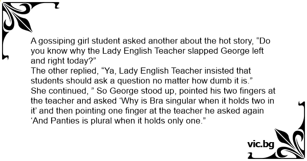 A gossiping girl student asked another about the hot story, “Do you know why the Lady English Teacher slapped George left and right today?”