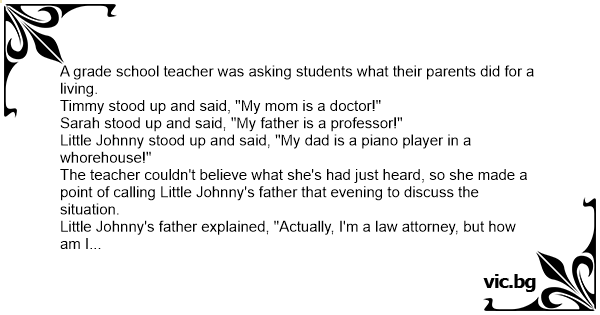 Little Johnny stood up and said, "My dad is a piano player in a whоrеhоusе!"