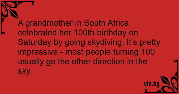 A grandmother in South Africa celebrated her 100th birthday on Saturday by going skydiving. It’s pretty impressive - most people turning 100 usually go the other direction in the sky.