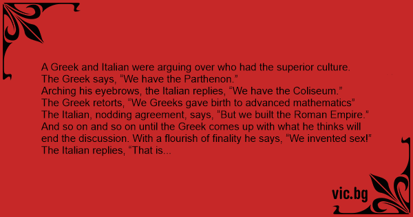 And so on and so on until the Greek comes up with what he thinks will end the discussion. With a flourish of finality he says, “We invented sеx!”