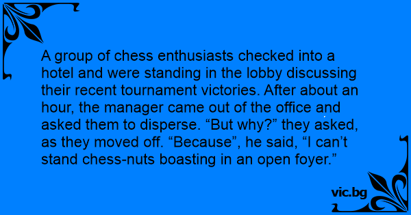 A group of chess enthusiasts checked into a hotel and were standing in the lobby discussing their recent tournament victories. After about an hour, the manager came out of the office and asked them to disperse. “But why?” they asked, as they moved off. “Because”, he said, “I can’t stand chess-nuts boasting in an open foyer.”