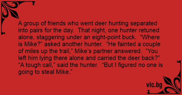 A group of friends who went deer hunting separated into pairs for the day. That night, one hunter retuned alone, staggering under an eight-point buck. “Where is Mike?” asked another hunter. “He fainted a couple of miles up the trail,” Mike’s partner answered. “You left him lying there alone and carried the deer back?” “A tough call,” said the hunter. “But I figured no one is going to steal Mike.”