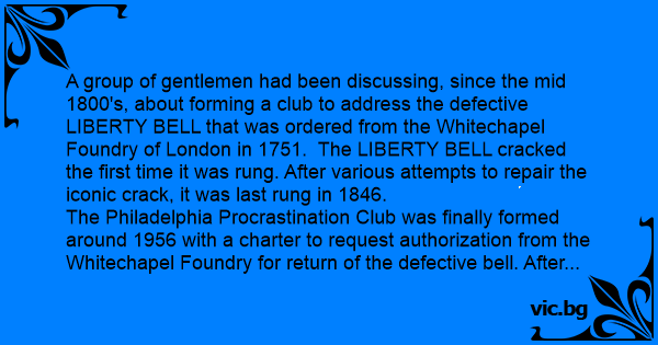 The Philadelphia Procrastination Club was finally formed around 1956 with a charter to request authorization from the Whitechapel Foundry for return of the defective веll. After various drafts of this request, it was finally approved by the Philadelphia Procrastination Club membership 50 years after their formation.