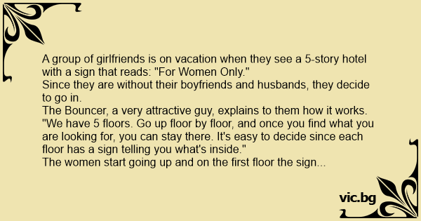 A group of girlfriends is on vacation when they see a 5-story hotel with a sign that reads: "For Women Only."