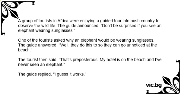 A group of tourists in Africa were enjoying a guided tour into bush country to observe the wild life. The guide announced, “Don’t be surprised if you see an elephant wearing sunglasses.”