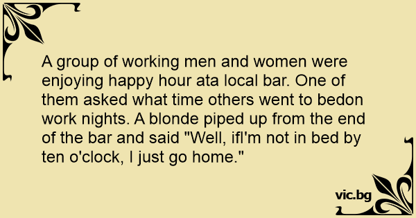 A group of working men and women were enjoying happy hour ata local bar. One of them asked what time others went to bedon work nights. A blonde piped up from the end of the bar and said "Well, ifI'm not in bed by ten o'clock, I just go home."