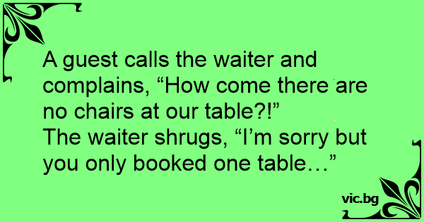 A guest calls the waiter and complains, “How come there are no chairs at our table?!”