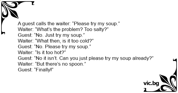 Guest: “No it isn’t. Can you just please try my soup already?”