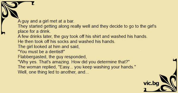 A guy and a girl meet at a bar. They get along so well that they decide to go to the girl’s place. A few drinks later, the guy takes off his shirt and then washes his hands. He then takes off his pants and washes his hands. The girl watches him and says, “You must be a dentist” The guy,...