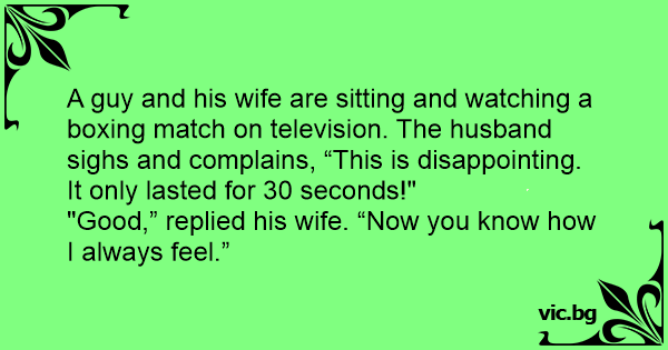 Manden og konen ser boksning på TV. Manden: Øv hvor skuffende, nu har jeg ventet på det her i over 4 uger og så er kampen ovre på 4 minutter. Konen: Det kender jeg godt!