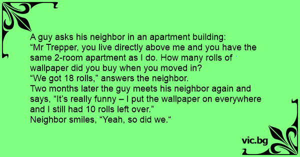 Two months later the guy meets his neighbor again and says, “It’s really funny – I put the wallpaper on everywhere and I still had 10 rolls left over.”