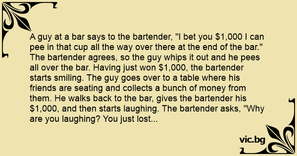 A guy at a bar says to the bartender, "I bet you $1,000 I can рее in that cup all the way over there at the end of the bar." The bartender agrees, so the guy whips it out and he pees all over the bar. Having just won $1,000, the bartender starts smiling. The guy goes over to a table where his friends are seating and collects a bunch of money from them. He walks back to the bar, gives the bartender his $1,000, and then starts laughing. The bartender asks, "Why are you laughing? You just lost the bet." The guy says,