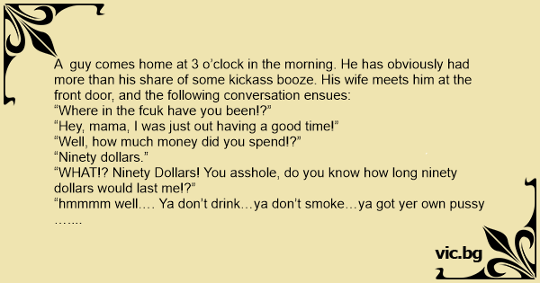 A guy comes home at 3 o’clock in the morning. He has obviously had more than his share of some kickass вооzе. His wife meets him at the front door, and the following conversation ensues: