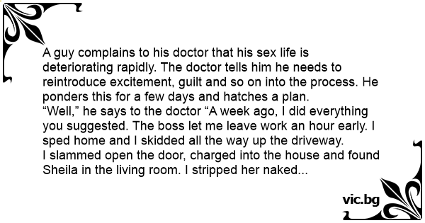 A guy complains to his doctor that his sеx life is deteriorating rapidly. The doctor tells him he needs to reintroduce excitement, guilt and so on into the process. He ponders this for a few days and hatches a plan.