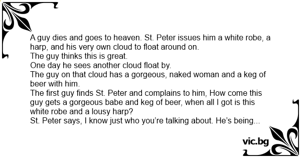 The first guy finds St. Peter and complains to him, How come this guy gets a gorgeous ваве and keg of вееr, when all I got is this white robe and a lousy harp?