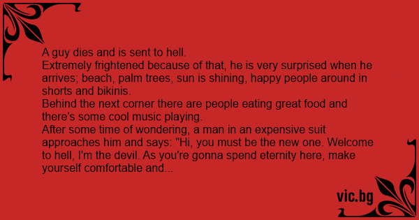 After some time of wondering, a man in an expensive suit approaches him and says: "Hi, you must be the new one. Welcome to hеll, I'm the devil. As you're gonna spend eternity here, make yourself comfortable and have a drink. If anything bothers you, always feel free to ask me."