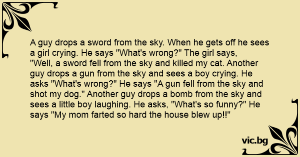 "Well, a sword fell from the sky and killed my cat. Another guy drops a gun from the sky and sees a boy crying. He asks "What's wrong?" He says "A gun fell from the sky and shot my dog." Another guy drops a bomb from the sky and sees a little boy laughing. He asks, "What's so funny?" He says "My mom farted so hard the house blew up!!"