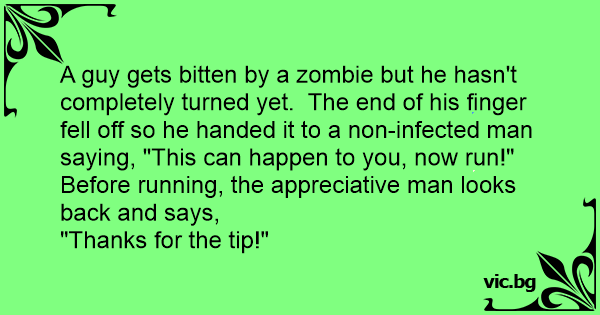 A guy gets bitten by a zombie but he hasn't completely turned yet. The end of his finger fell off so he handed it to a non-infected man saying, "This can happen to you, now run!"