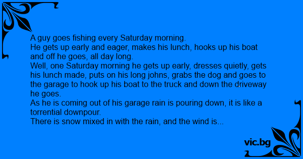 Το Σάββατο πρωί σηκώθηκα νωρίς, ντύθηκα ήσυχα, έφτιαξα το πρωινό μου και πήγα στο γκαράζ. Έδεσα την βάρκα στο φορτηγάκι, και έκανα να βγώ από γκαράζ όταν διαπίστωσα ότι έβρεχε καταρρακτωδώς. Πήγα...
