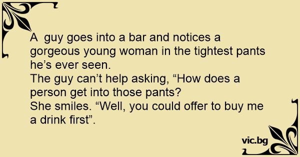A guy goes into a bar and notices a gorgeous young woman in the tightest pants he’s ever seen.