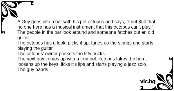 Blæksprutten En mand kommer ind i en bar med en blæksprutte. Han fortæller kunderne i baren, at det er en meget talentfuld blæksprutte, der kan spille på et hvilket som helst musikinstrument. De...