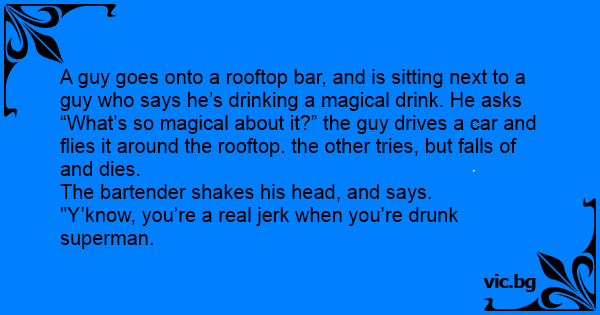 Un hombre entra a un bar situado en la azotea de un hotel y se sienta junto a otro tipo. - «¿Qué estás bebiendo?» Le pregunta al hombre que tiene a su lado.-«Cerveza mágica», contesta el otro.-«¿Si? ¿Y qué tiene de mágica? Entonces el otro se gira, da un trago a su cerveza, se tira al vacío y...