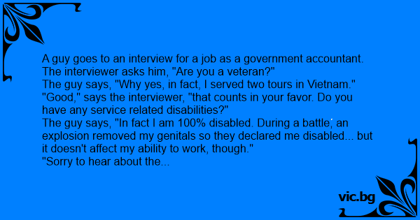Интервю за работа в държавната администрация. Интервюиращият: - Разкажете ни повече за себе си? - Ами бях наемен войник преди време, настъпих мина и си загубих топките. Другото важно е, че имам...