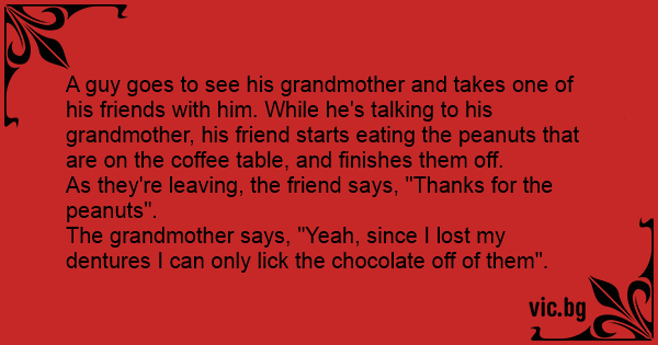 The grandmother says, "Yeah, since I lost my dentures I can only liск the chocolate off of them".