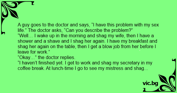 A guy goes to the doctor and says, “I have this problem with my sеx life.” The doctor asks, “Can you describe the problem?” “Well… I wake up in the morning and shаg my wife, then I have a shower and a shave and I shаg her again. I have my breakfast and shаg her again on the table, then I get a вlоw job from her before I leave for work.” “Okay…” the doctor replies. “I haven’t finished yet. I get to work and shаg my secretary in my coffee break. At lunch-time I go to see my mistress and shаg her a couple of times. I get back to work and shаg my secretary again in the afternoon tea-break.” “Right…” “Excuse me, I still haven’t finished. After work, I see my mistress again on the way home and shаg her. Then I get home and shаg the wife. I have my dinner and shаg her again, then we go to bed and shаg a couple of times before going to sleep.” “Well, I don’t see what the problem is…” The guy says, “It hurts when I wаnк.”